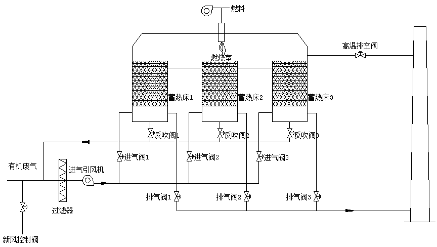 蓄热式热力氧化炉——RTO的工作原理:把有机废气加热升温至760~800℃左右,使废气中的VOC氧化分解为无害的CO2和H2O;氧化时高温气体的热量被蓄热体“贮存”起来,用于预热新进入的有机废气,从而节省升温所需要的燃料消耗,降低运行成本。
