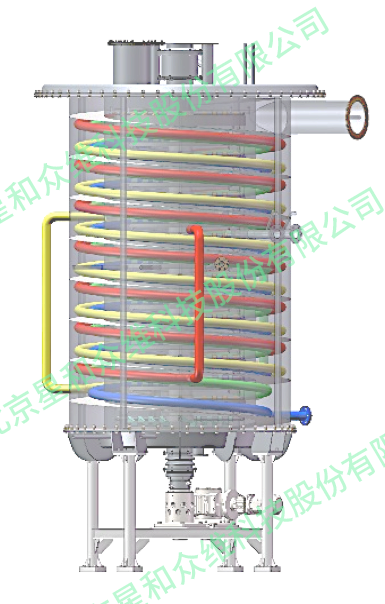 系统包括:缓冲罐、定量泵送单元、机械脱水装置、立式多段热解炉、冷却段、气液分离单元、尾气处理单元、余热回用单元、控制系统等组成。热解炉使用了间接加热、中温热解及独特的循环热解技术,其如下图所示:
