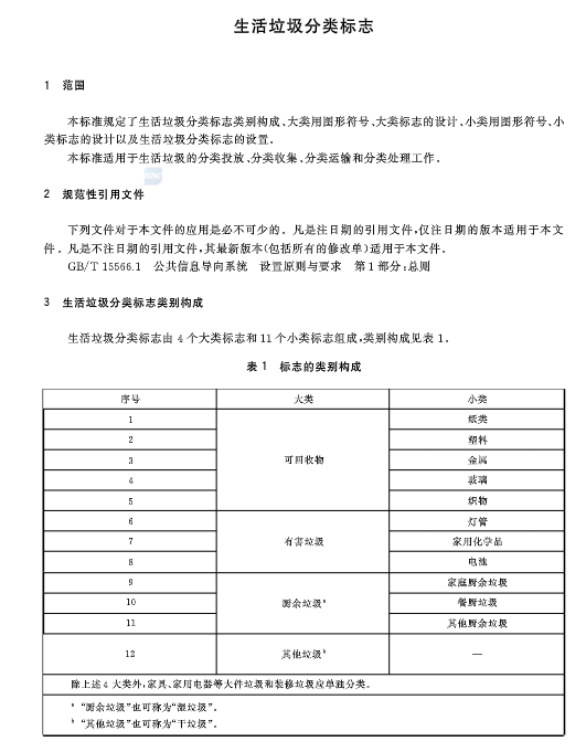 日前,国家市场监督管理总局、中国国家标准化管理委员会发布《生活垃圾分类标志》,全文如下: