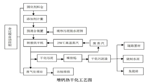 污泥增钙干化是一种经济、有效的脱水污泥无害化处理工艺技术,其运行费用低廉,操作简便,并且可在源头对污泥进行有效的消毒、灭菌、除臭和减量。该技术处理后得到的增钙土,可二次加工成为水泥的生料、制砖的原材料、和路基工程填料及垃圾填埋场覆盖土等,并在实施使用过程中,对污泥中的重金属离子有效的捕捉并给予固化,彻底的控制了市政污泥对环境的二次污染以及实现了资源化的再生利用。所处理的有机污染土中的重金属充分固化、多环芳烃的去除率可达到95%,无害化程度可以满足DB11/T 801-2011北京市地方标准(工业/商服)用地及JTGE 51-2009路基材料的国家标准。