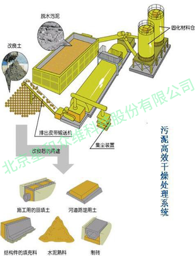 技术装备针对不同含水率的有机废物(污染土、污泥)进行处理,当污染土的含水率较低的状态时,通过调整液体的强氧化剂的添加量,用以强化固体发热剂的高效发挥。系统包括:污泥接收料仓、添加剂料罐、污泥输送系统、添加剂计量输送系统、污泥与搅拌系统、回转式污泥干燥系统、粉尘收集系统、除臭系统、控制系统等组成。